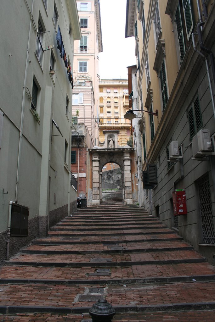 Faccio un piccolo inciso per dare l’idea della situazione successiva. Le scale di cui parlo sono i classici gradini delle creuza genovesi. Ovvero bassi, lunghi e pendenti. Della serie: “Puoi farli con una carrozzina, ma ti fai un culo così”.